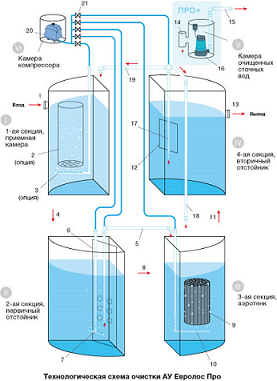 Несмотря на повышенные требования к простоте эксплуатации конечным потребителем, в АУ реализована современная технология очистки сточных вод, которая представляет собой полный цикл механико-биологической очистки и включает следующие основные этапы: